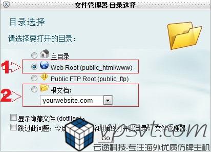 2、目录选择。这时候cpanel会让你选择目录(如图2所示),如果cPanel只相关一个网站的话,直接选择1即可;如果cPanel管理着多个站点,则在2处选择相应的根文件夹。此时,我们假设在”yourwebsite.com”下安装wordpress文件,则将选择2,点击进入。
