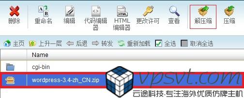 4、确定解压缩文件的相关内容。上传完毕后,根据提示回到根目录下。你会发现,这时文件目录里多了一个wordpress压缩包。点击wordpress压缩包,然后在顶栏工具中选择“解压缩”(如图5所示)。