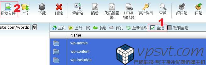 进入WordPress文件夹后(如图8所示),点击全选(如图8中标注1),然后在顶栏工具中找到“移动文件”(如图8中标注2)并点击。