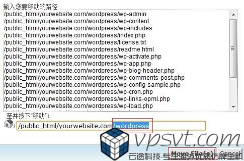 将这些文件移动到根目录下的,只需要将文件列表下方的路径修改一下就可以(如图9所示),将域名后面的“/wordpress”去掉即可。确定目录后,点击“Move File(s)”。