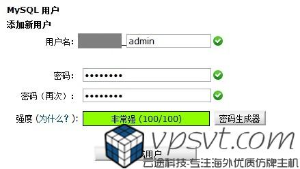 新数据库创建好了,接下来我们开始创建用户。找到”mysql用户“的”添加新用户“。这里填写的用户名和密码一定要记住,如果你想搭建wordpress的话,它将在首次登陆的时候被填写。