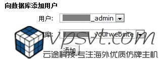 点击生成用户,于是一个新的用户被创建成功了,我们需要将新创建的用户添加进新创建的数据库里,并赋予权限。找到”向数据库添加用户“,上面选中刚刚创建的数据库,下面选中刚刚创建的用户。点击添加。