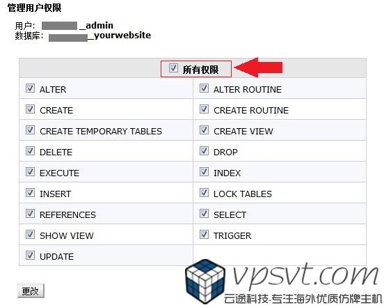 点击完”添加“后,系统会弹出权限设置页面,左上角对比信息查看是不是刚刚创建的两个账户名称。如果是管理员级别的用户(也就是网站的创建者),这里点击”所有权限“,点击”更改“保存。