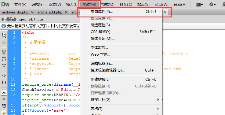 第一步:点击DW软件“修改(M)”展开后点击“页面属性(P);