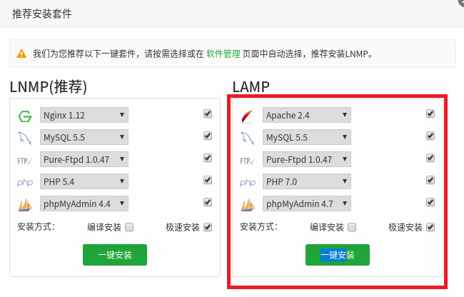 浏览器打开宝塔面板,首次登陆就会推荐安装LANMP 注意php7.0