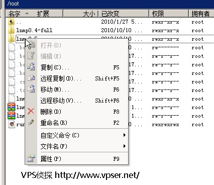 在要操作的目录上,右击就会出现复制、远程复制、移动、远程移动、删除、重命名、属性(设置权限和属主),如下图: