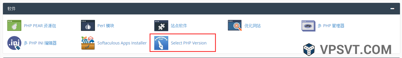 1、登录云途主机的 cpanel 控制面板,往下拉动找到软件栏目,并点击“SELECT PHP VERSION”。
