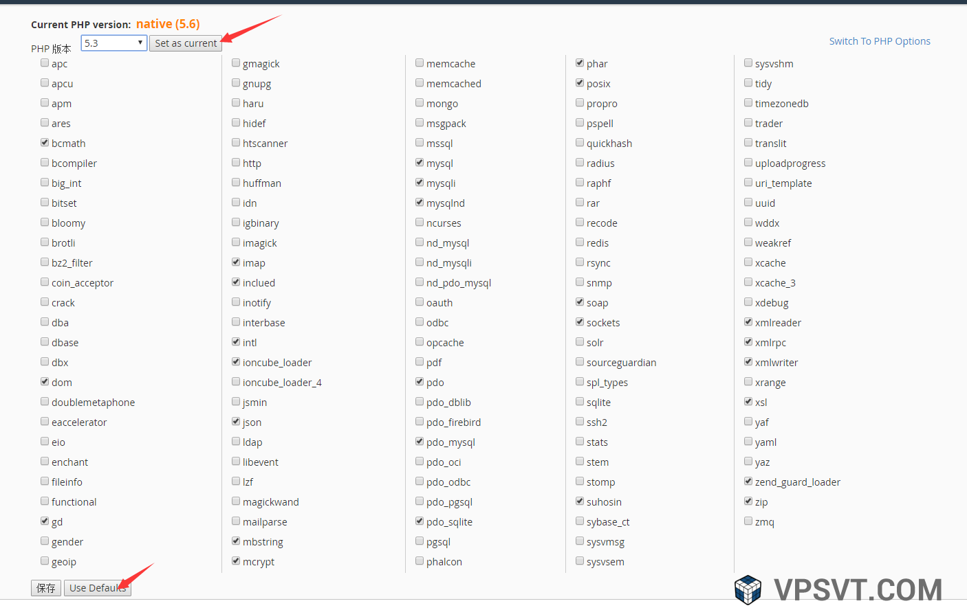 2、在左上角的 PHP 版本处选择相应的 PHP 版本,接着在显示出来的参数选项中保持默认(如果您是 PHP 程序员,对于参数有特殊需求,那么可以根据需求进行修改,对于绝大多数客户而言,这里的参数不需要修改),然后点击“SET AS CURRENT”即可切换 PHP 版本完成。具体如下图所示: