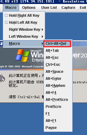 通过如上菜单的指示,我们可以直接向主机发送一些常用的组合键,最常用的莫过于 ctrl+alt+del了。