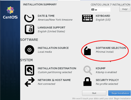 软件SOFTWARE”-“软件选择SOFTWARE SELECTION”,我们使用的是Minimal版本,默认是最小化安装。