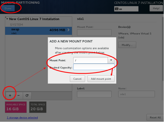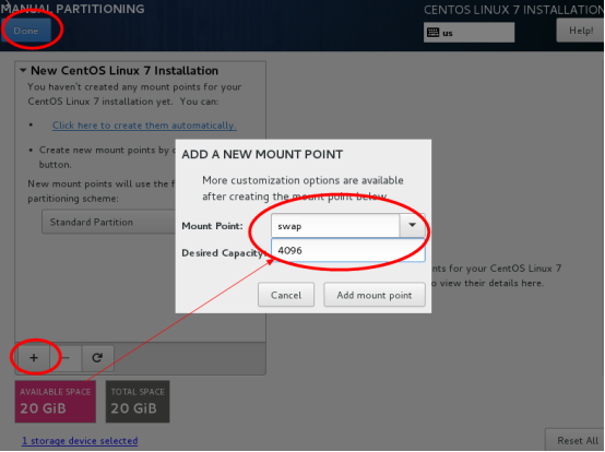 点左下角的“+”号,挂载点:swap,期望容量:4096,添加挂载点,如下图所示,继续点左下角的“+”号,挂载点:“ / ”期望容量:留空 #默认为剩余所有空间,添加挂载点,如下图所示