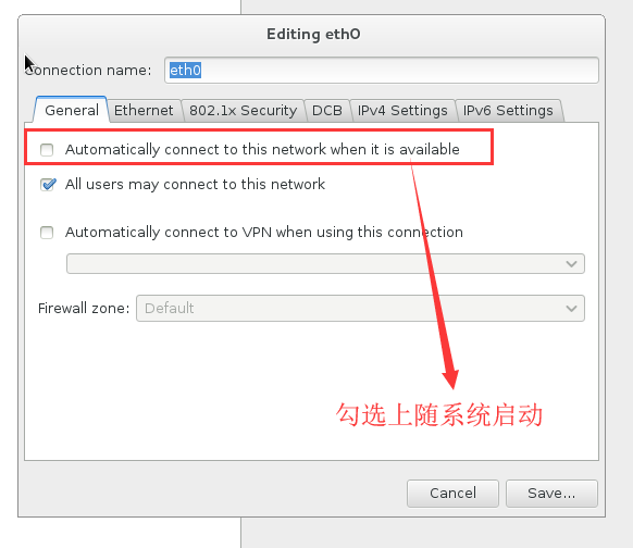 进入配置后,根据下图勾选上centos7 网卡随系统启动;